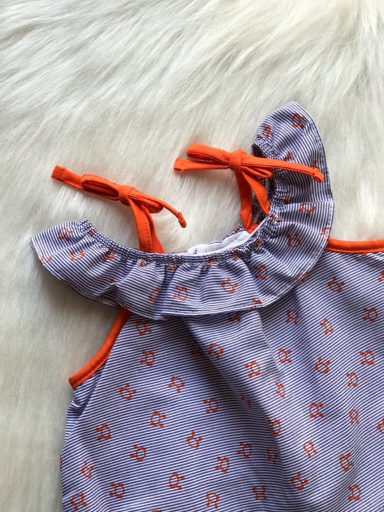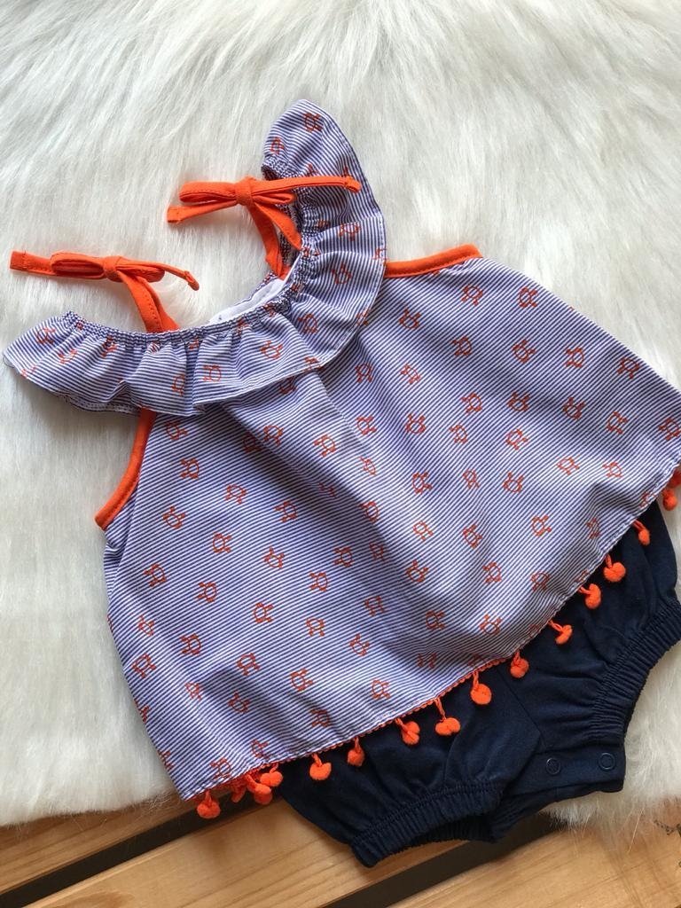 Possui uma sainha com pompons na cor laranja na barra, que ajudam a dar mais movimento a peça!