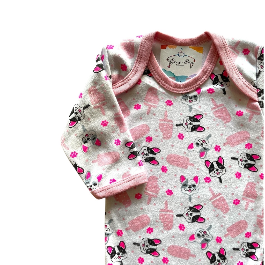 Body confeccionado na cor branca, com gola transpassada, com estampa rotativa de cachorrinha e picolé, fechamento entre as perninhas por botões de pressão.