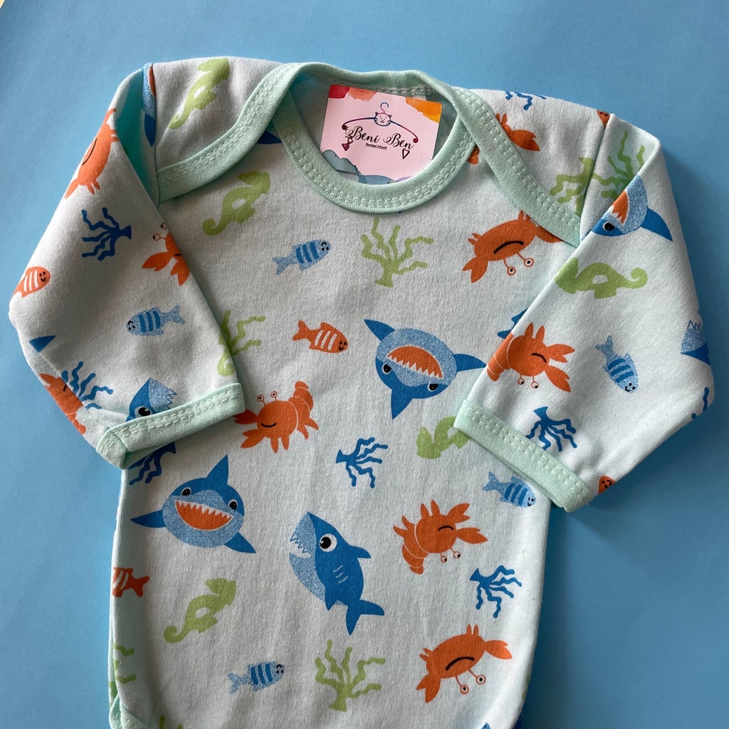Possui gola transpassada que facilitam as trocas de fraldas e fechamento por botões de pressão entrepernas!