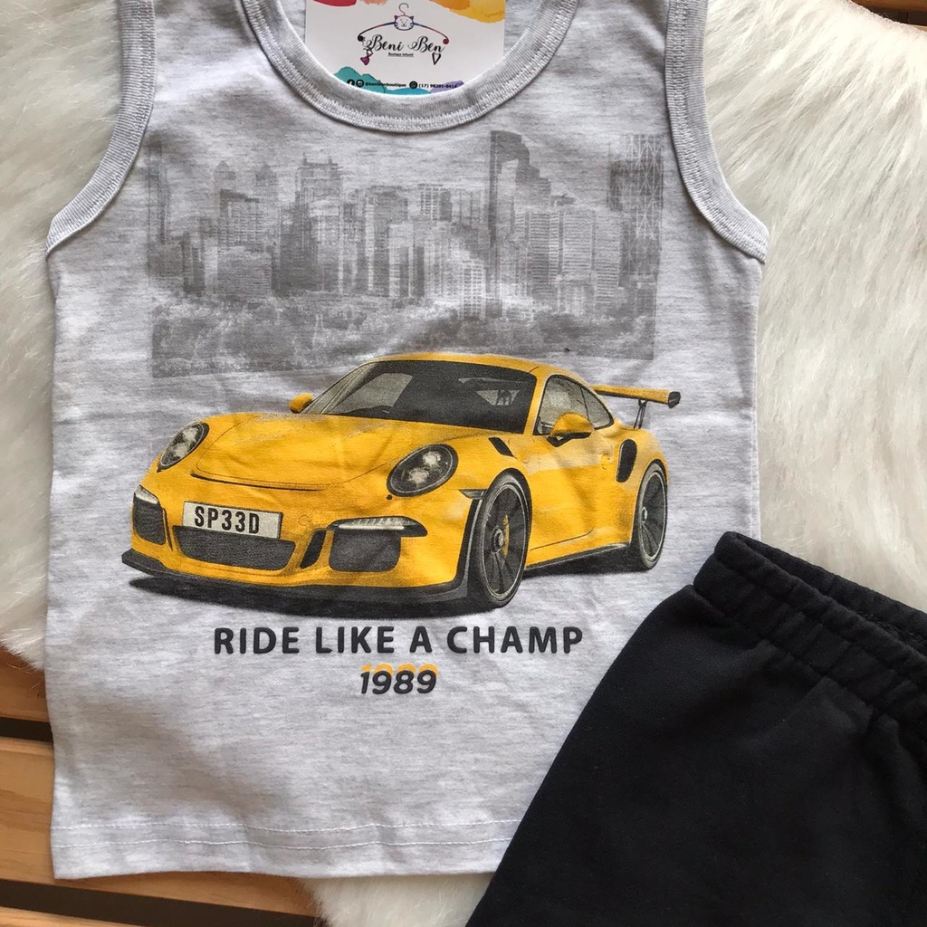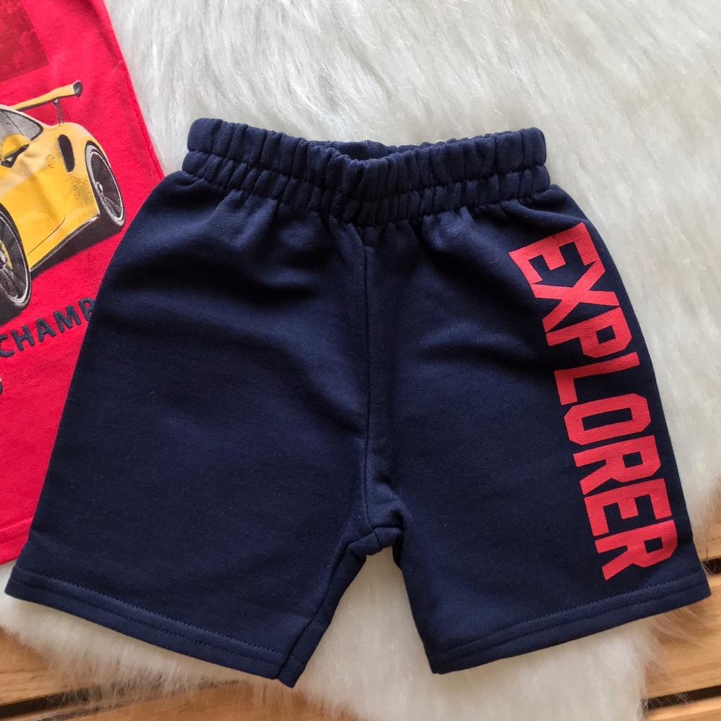 A Regata Infantil Masculino Kyly possui modelagem tradicional e estampa frontal com detalhes em relevo. A Bermuda Infantil Masculina Kyly possui escrita na lateral da perna e elástico no cós para maior conforto.