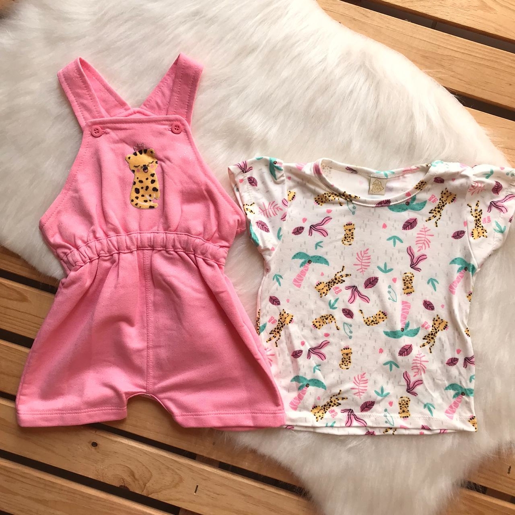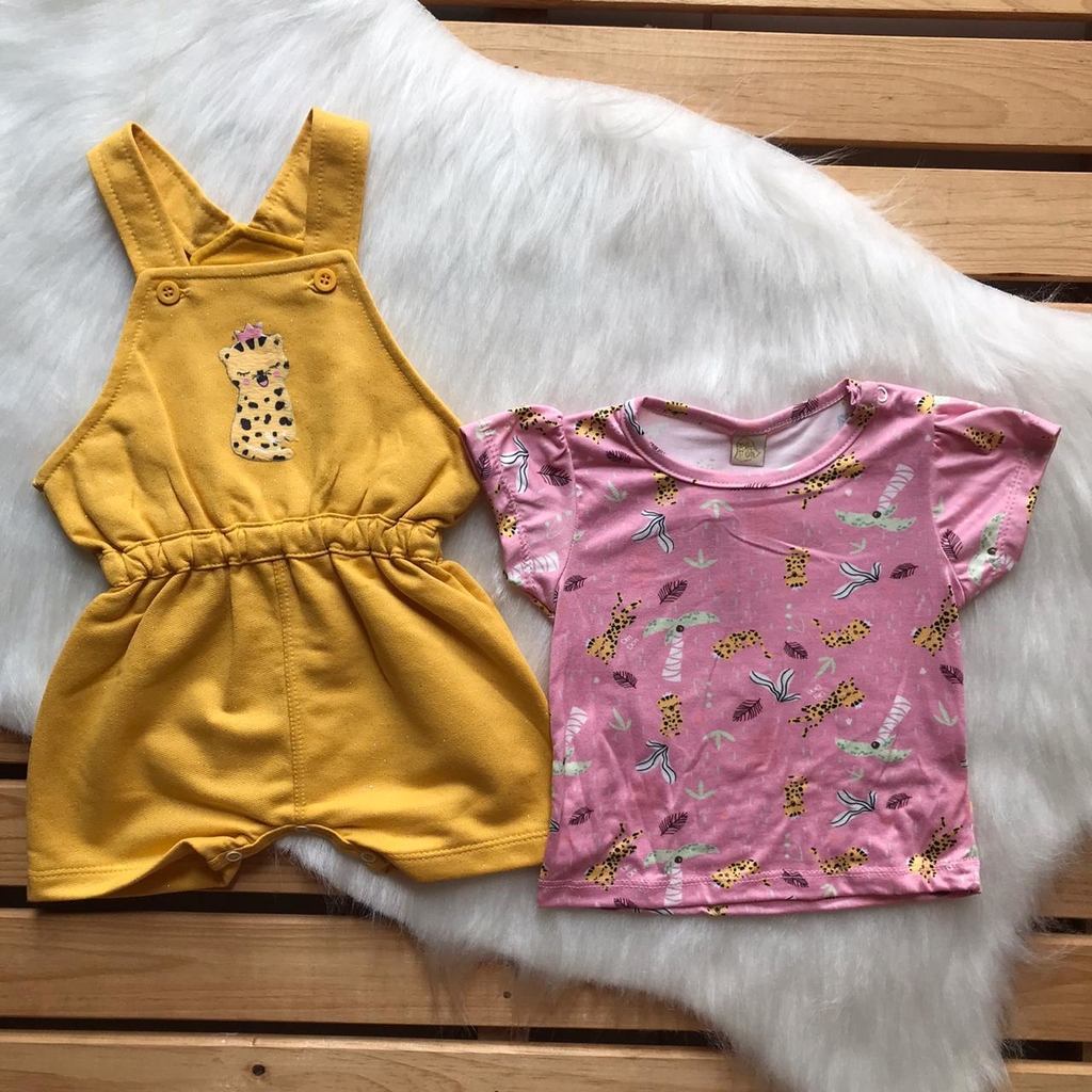 A camiseta possui manga princesa e regulagem na gola em botões. A jardineira possui um elástico acinturadoe botões nas alças!