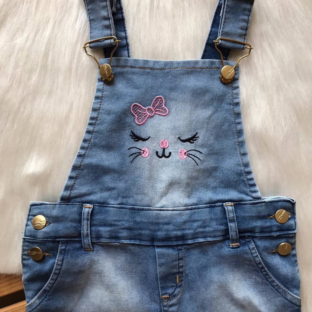 Jardineira feminina com detalhe bordado, possui botões nas laterais, bolsos dianteiros e traseiros e regulagem nas alças!