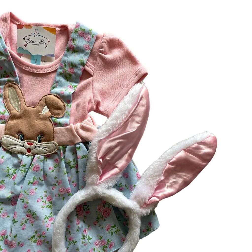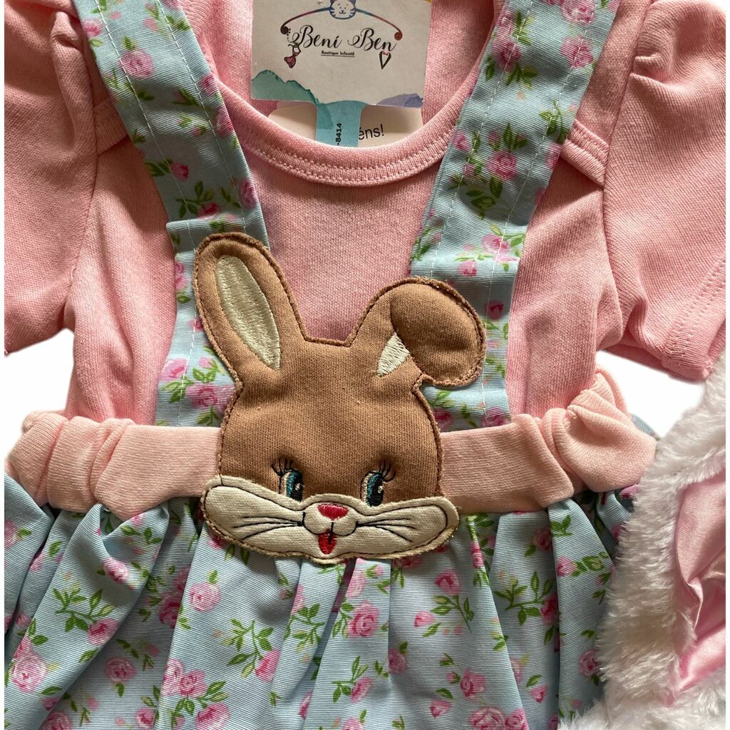 Kit composto por 3 peças, sendo elas: 1 body com detalhe nas mangas, fechamento entrepernas por botões de pressão; 1 jardineira com alças cruzadas nas costas; 1 arquinho com orelhinhas.