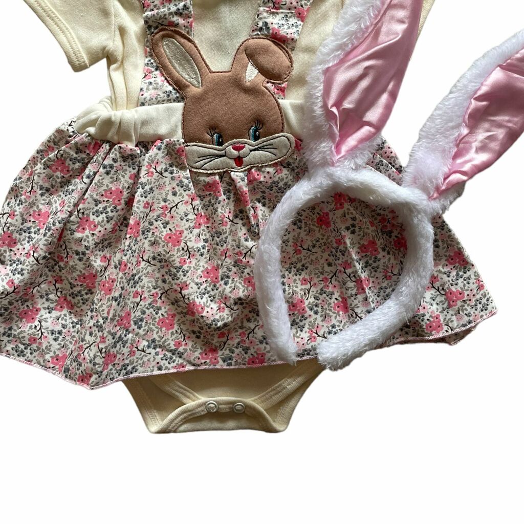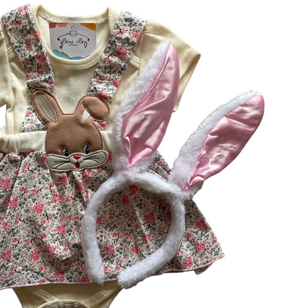 Kit composto por 3 peças, sendo elas: 1 body com detalhe nas mangas, fechamento entrepernas por botões de pressão; 1 jardineira com alças cruzadas nas costas; 1 arquinho com orelhinhas.
