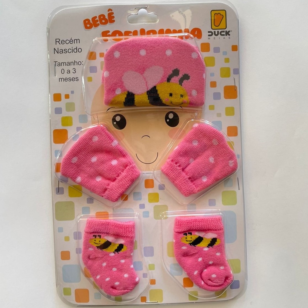 Para o sua pequena ficar protegida durante os primeiros meses, as peças foram produzidas que material macio confortável ajudando a mater a temperatura do corpo. A meinha foi feita com costura verdadeira que não incomoda o pezinho.