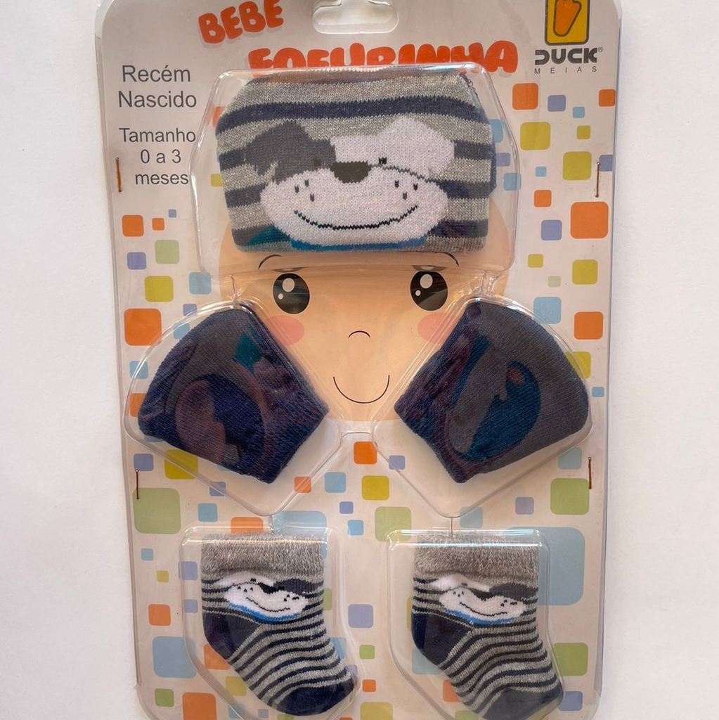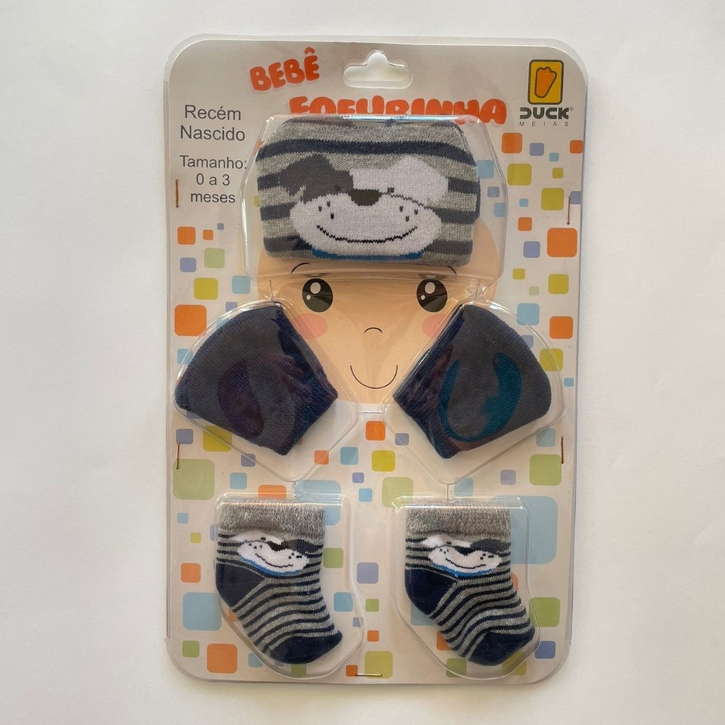 Kit masculino composto por 1 par de meias, 1 par de luvas e 1 touquinha.