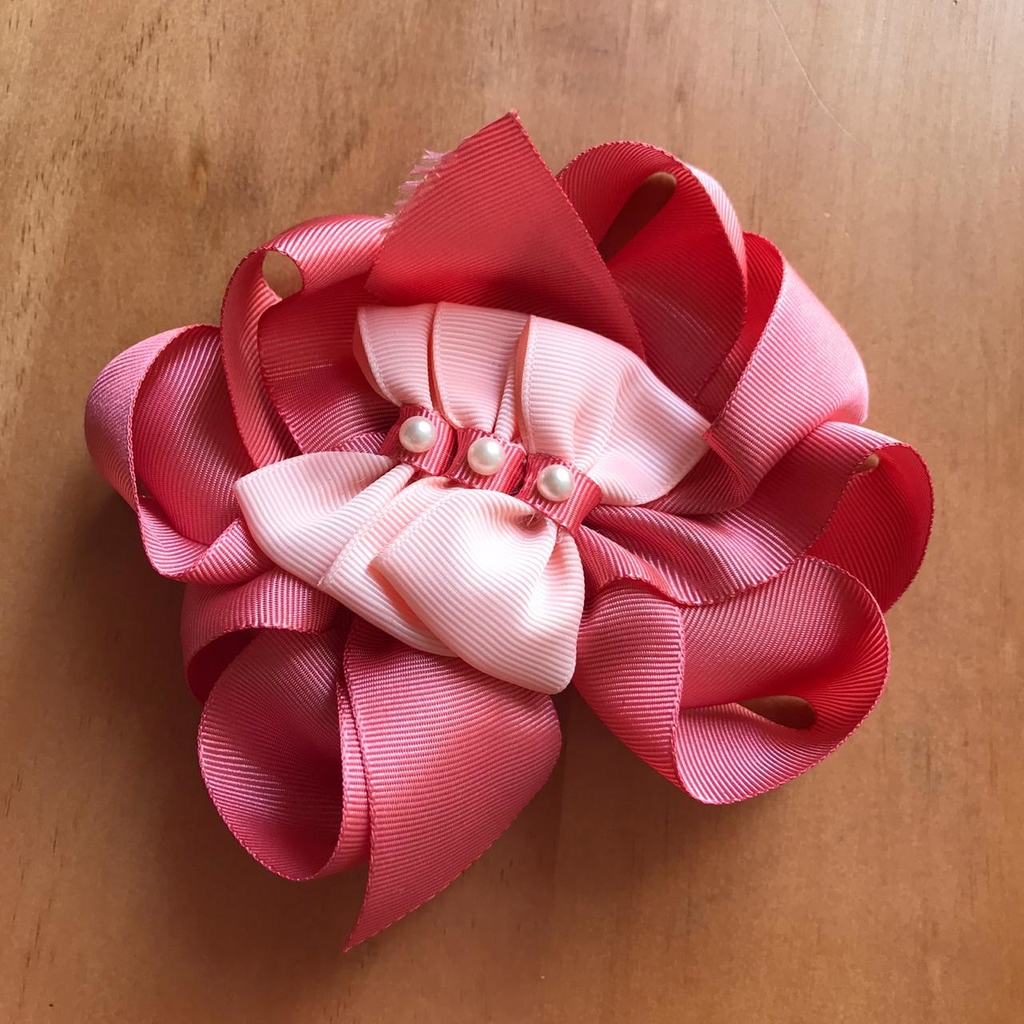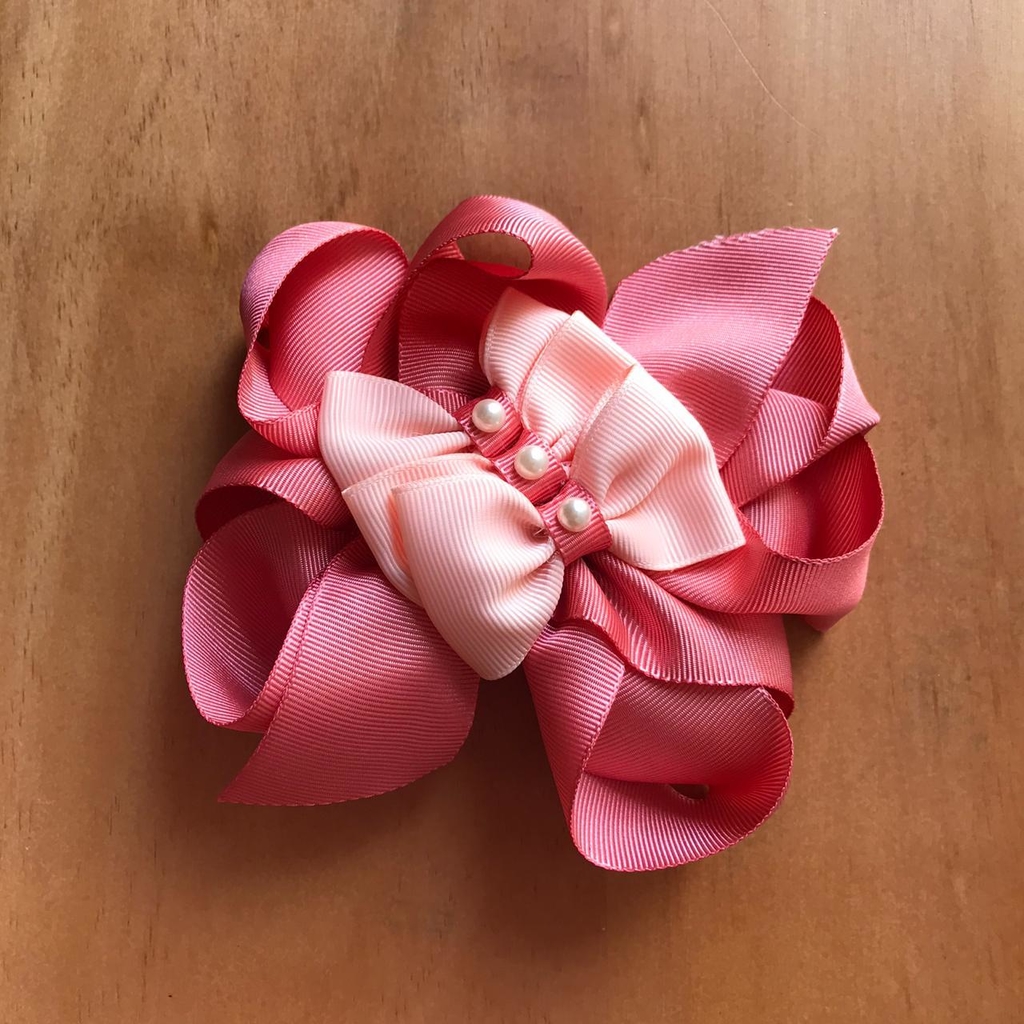 Laço duplo para cabelo, na cor rosê com 3 mini laços no centro e aplicação de meia pérola!