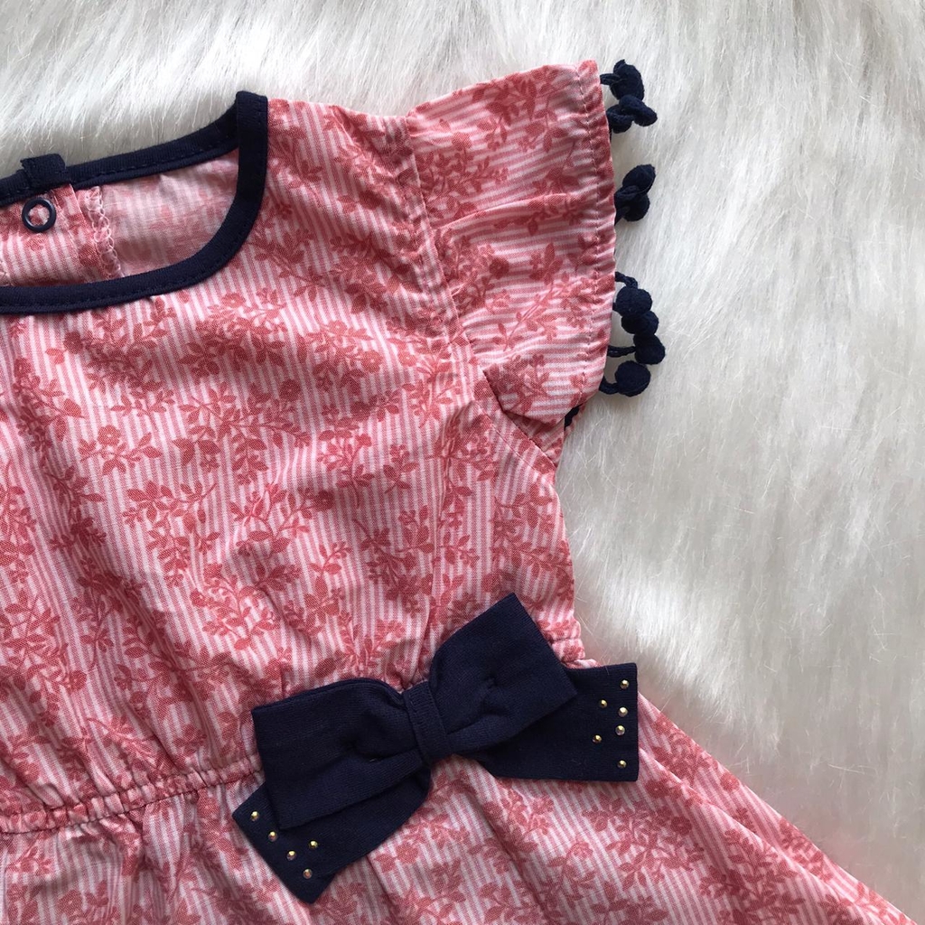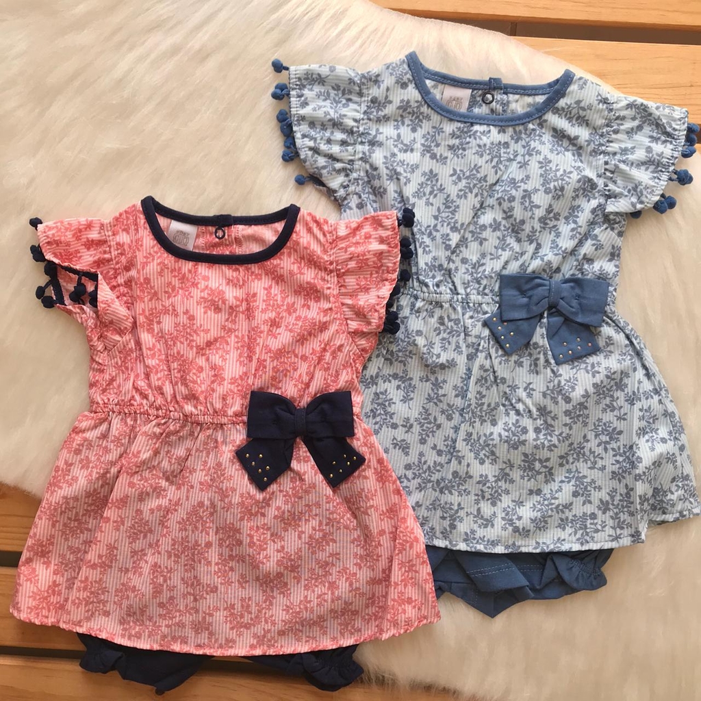 Macacão curto Baby Gijo floral na cor azul com salmão, mangas princesas com pompom, saia de sobreposição e um lindo laço!