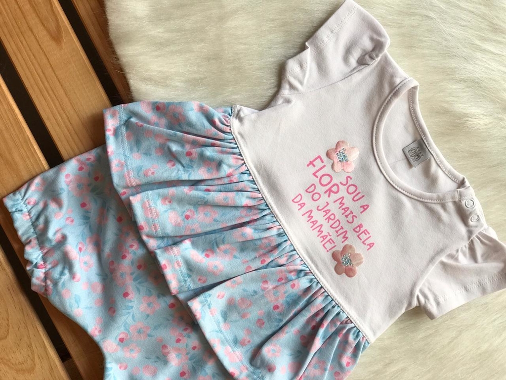 Macacão curto Baby Gijo frase " Sou a flor mais bela do jardim da mamãe!" - Com saia de sobreposição e fechamento em botões de pressão!