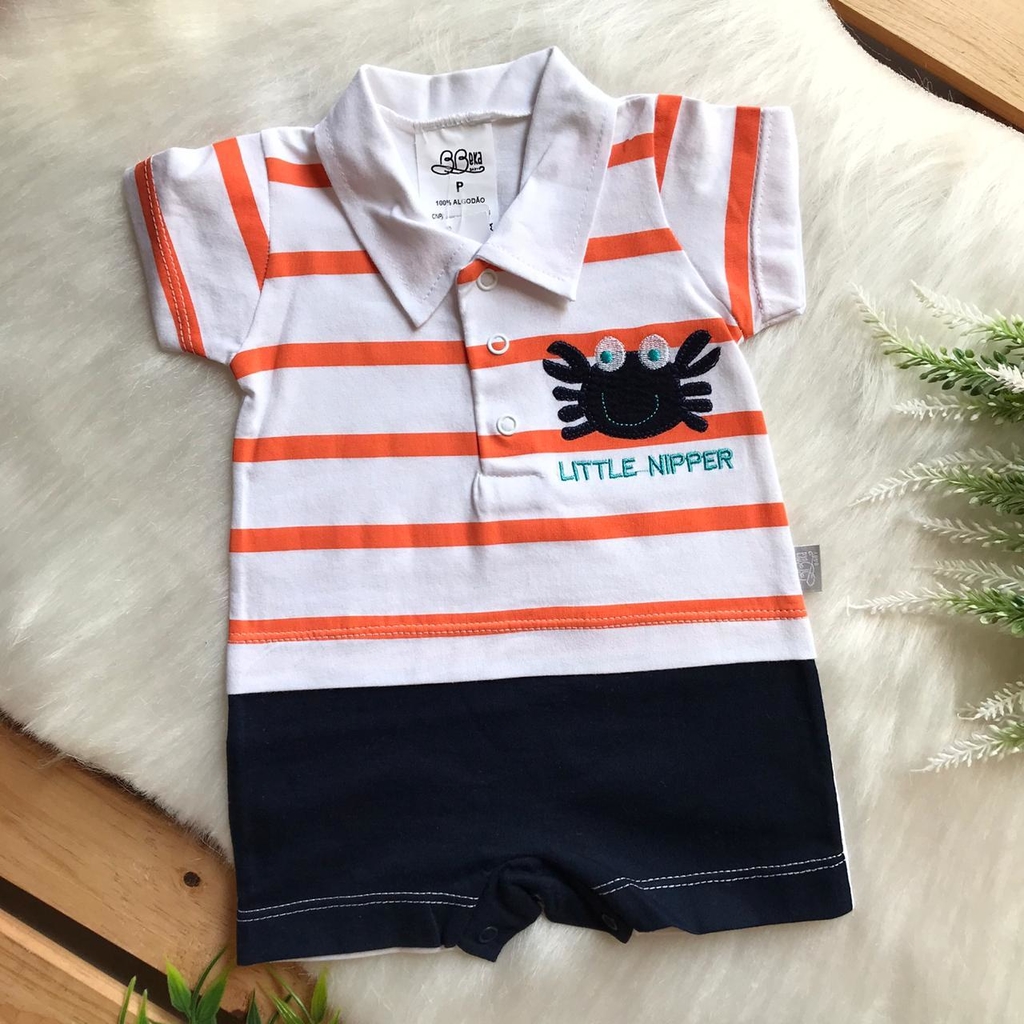 O Macacão Beka possui estampa listrada e um lindo bordado de Carangueijo, com cores que contrastam entre si, dando mais vida a peça!