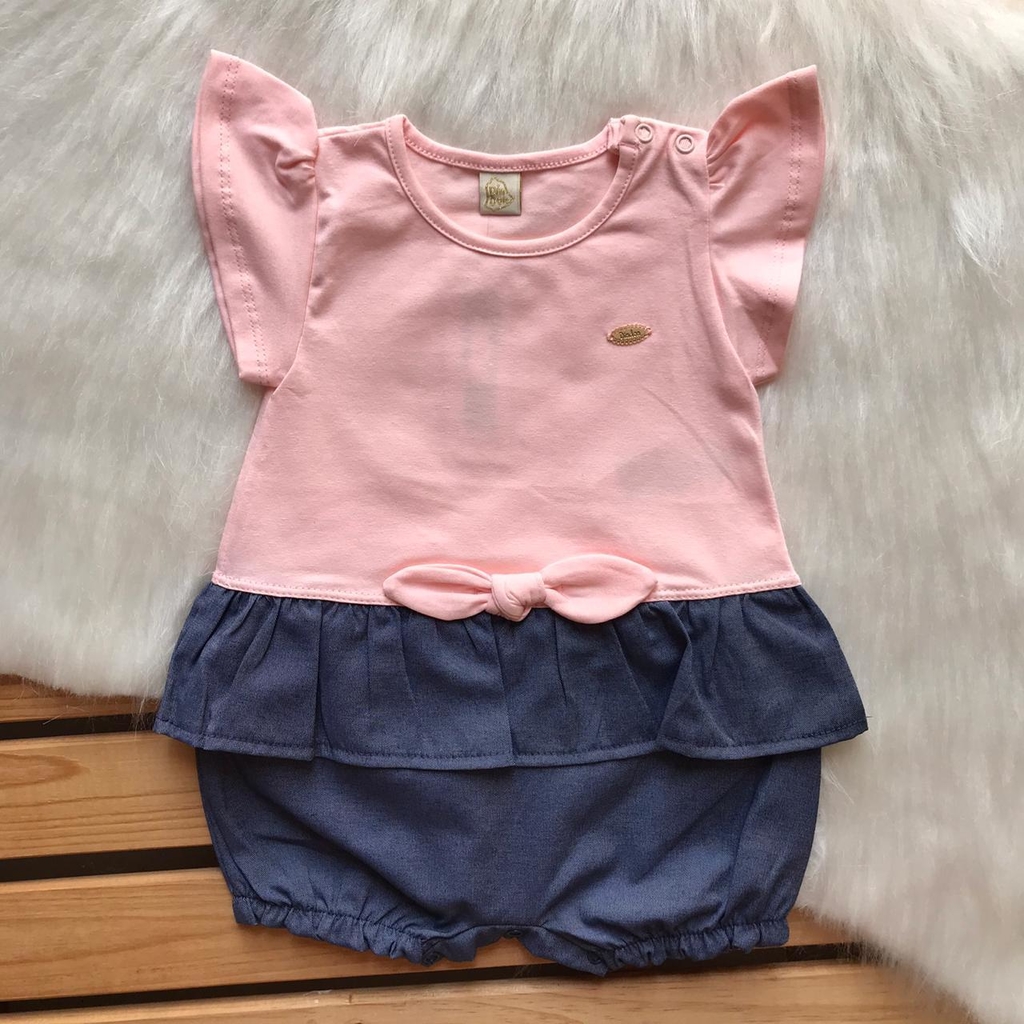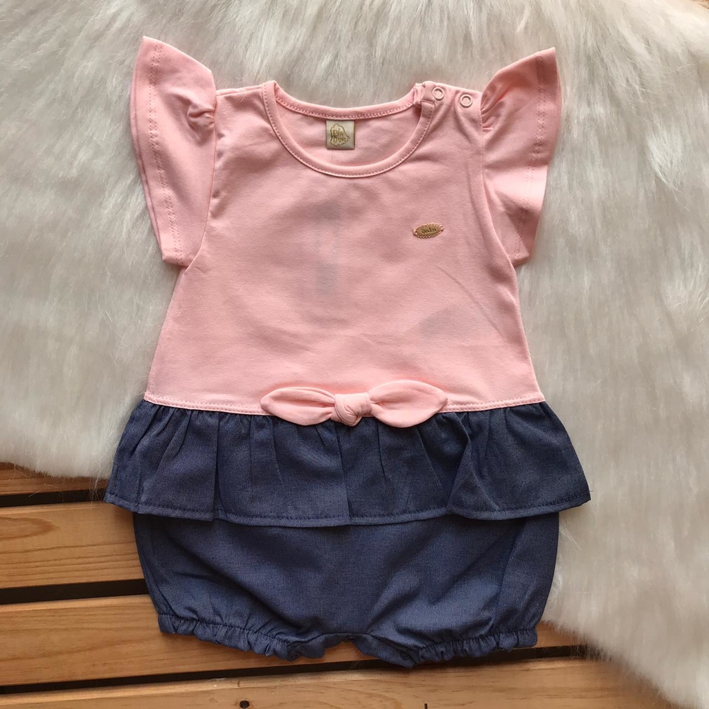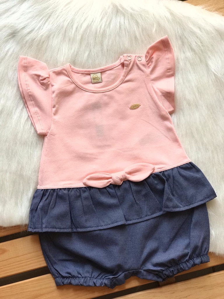 Macacão Curto Din Don com manga princesa, saia com sobreposição, laço na saia, jeans fake e fechamento em botões de pressão!