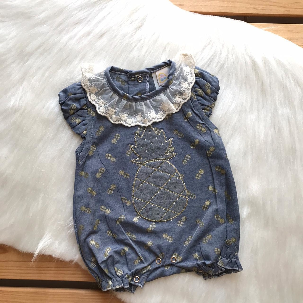 Esse lindo macacão Din Don esbanja delicadesa! É confeccionado em jeans, possui detalhes em abacaxi dourado, bem como uma linda gola trabalhada em renda. Possui fechamento em botões de pressão!