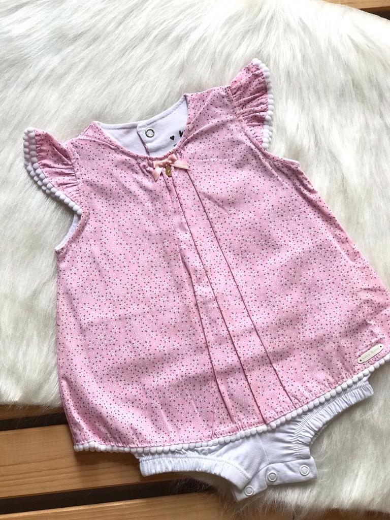 Macacão curto Keko tipo bata na cor rosa, detalhes em pregas e pompons, fechamento em botões de pressão!