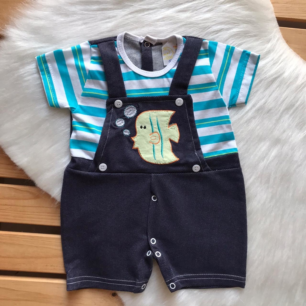 Macacão curto curto Kiguri Baby listrado, possui bordado de peixinho, alças com detalhe em botões e tecido jeans fake!