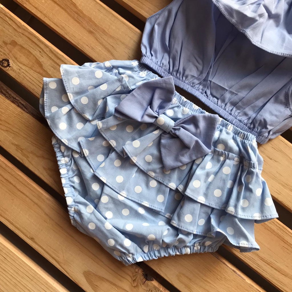 Características: Copped ciganinha na cor azul bebê, calcinha bunda rica de bolinha com laço e laço de cabelo!