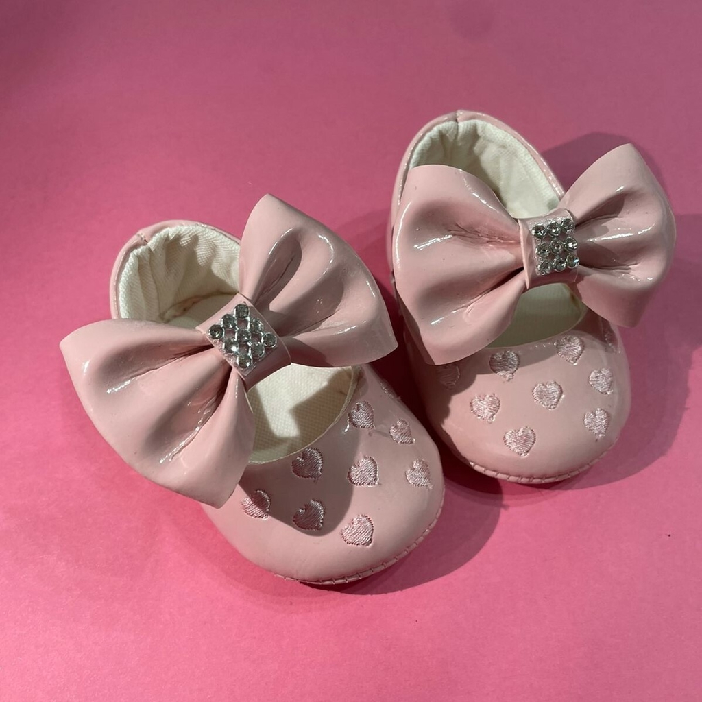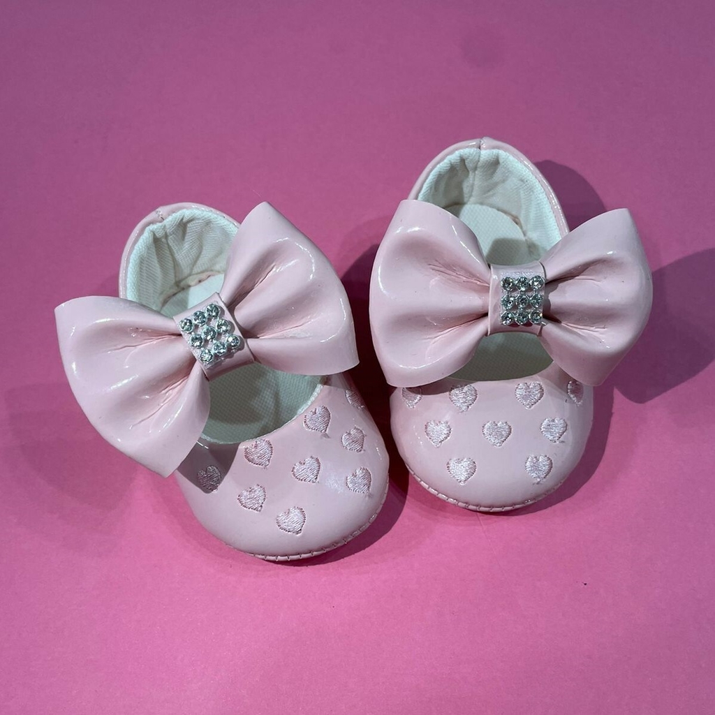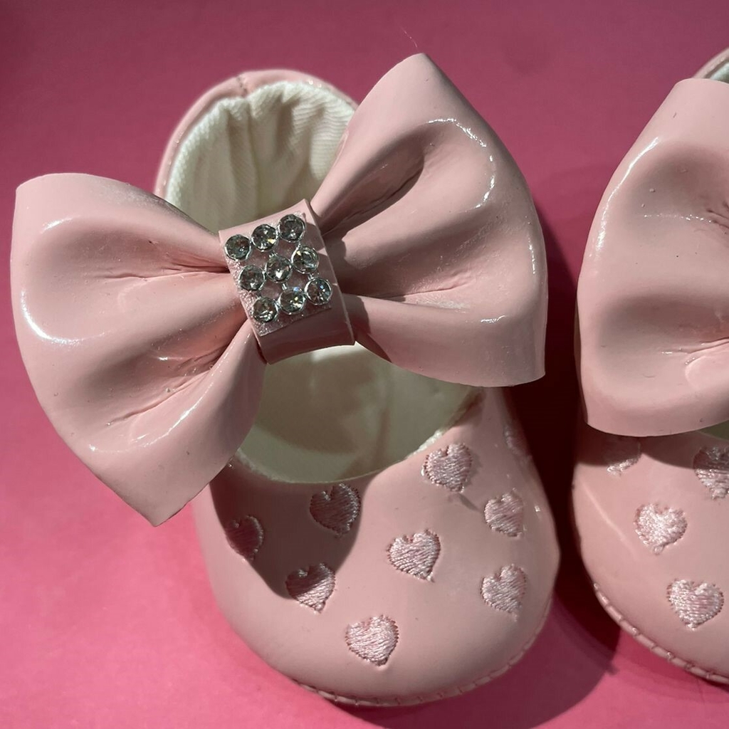 Possui pequenos bordados de corações e um lindo laço com strass.