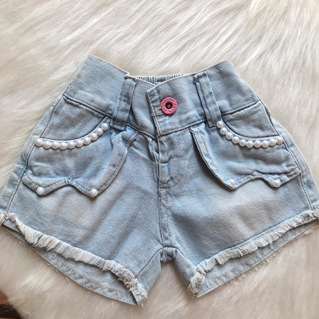 Confeccionado em jeans claro, possui detalhes frontais em aplicação de meia pérola branca!