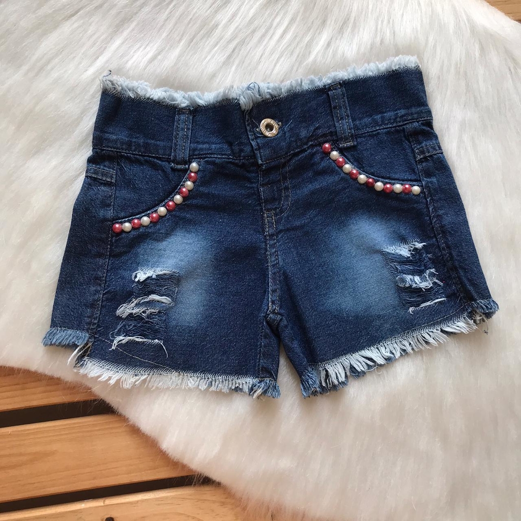 Confeccionado em jeans, possui detalhes frontais em aplicação de meia pérola colorida e botão rosa!