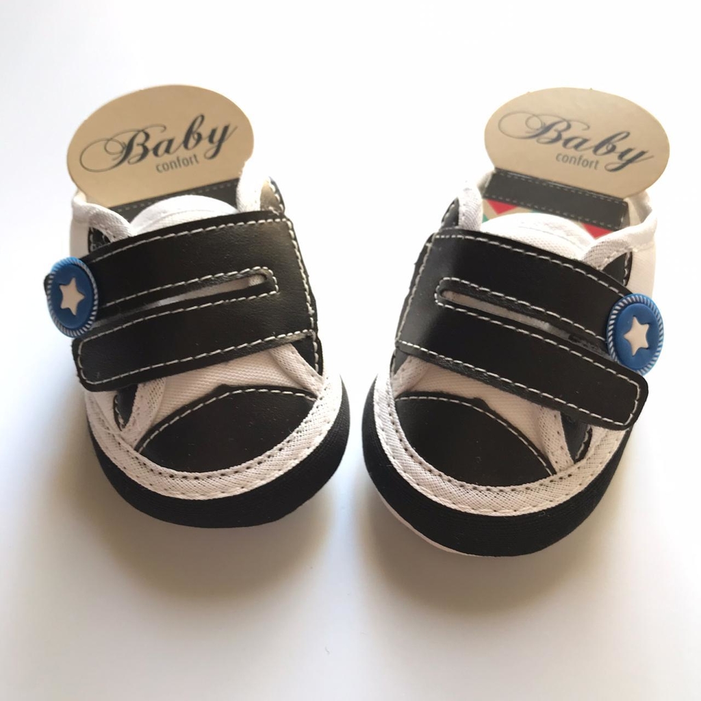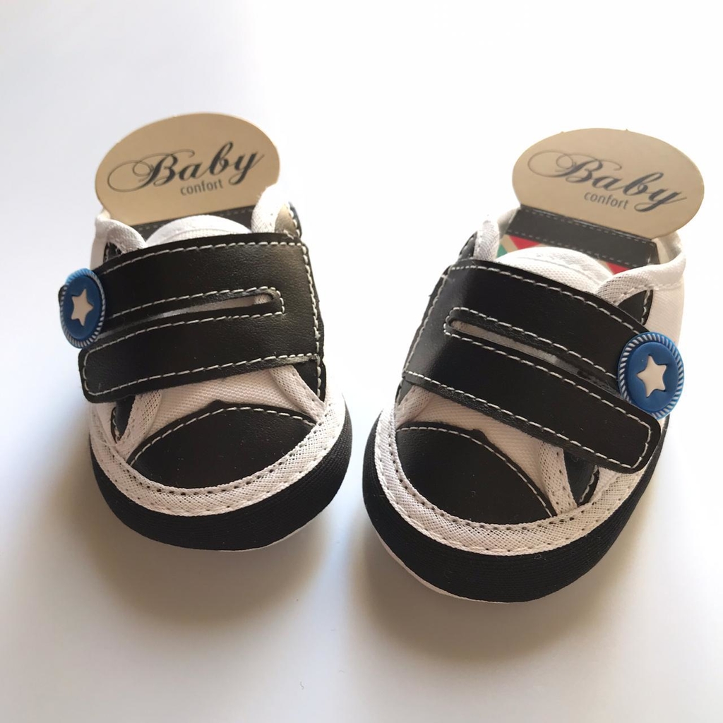 Tenis com fechamento em velcro, acabamento em azul marinho!