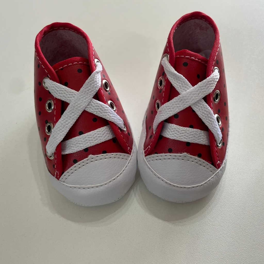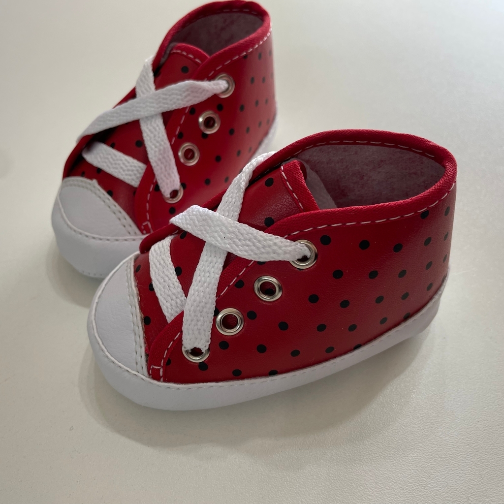 Possui ajuste por cadarço branco, acabamento em viés em cor combinada ao calçado e linha no solado confeccionado em material macio e leve.