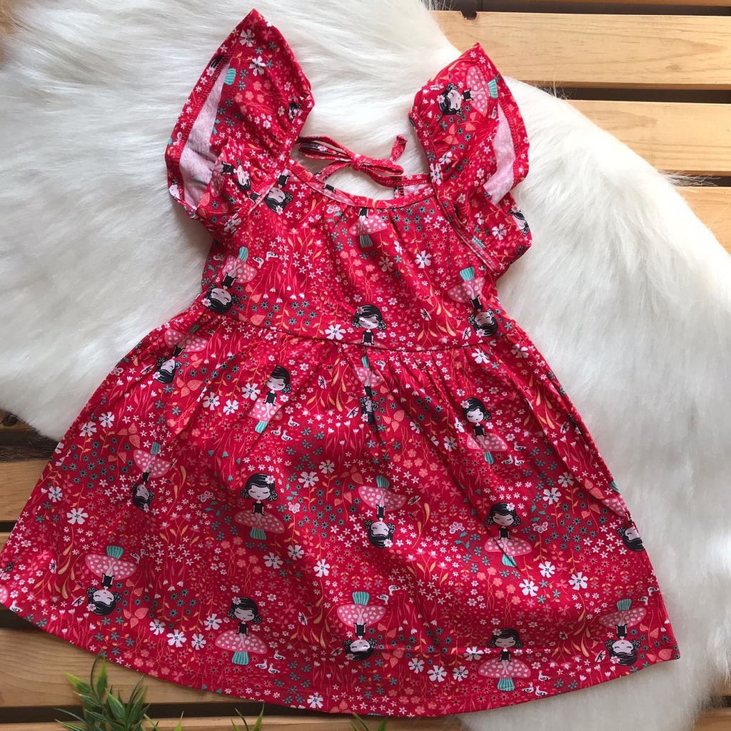 Vestido Infantil Nanai confeccionado em Meia Malha, possui estampa rotativa, recorte franzido na cintura e mangas com babados. O charme do Vestido fica por conta da abertura costas, com fita para amarração.